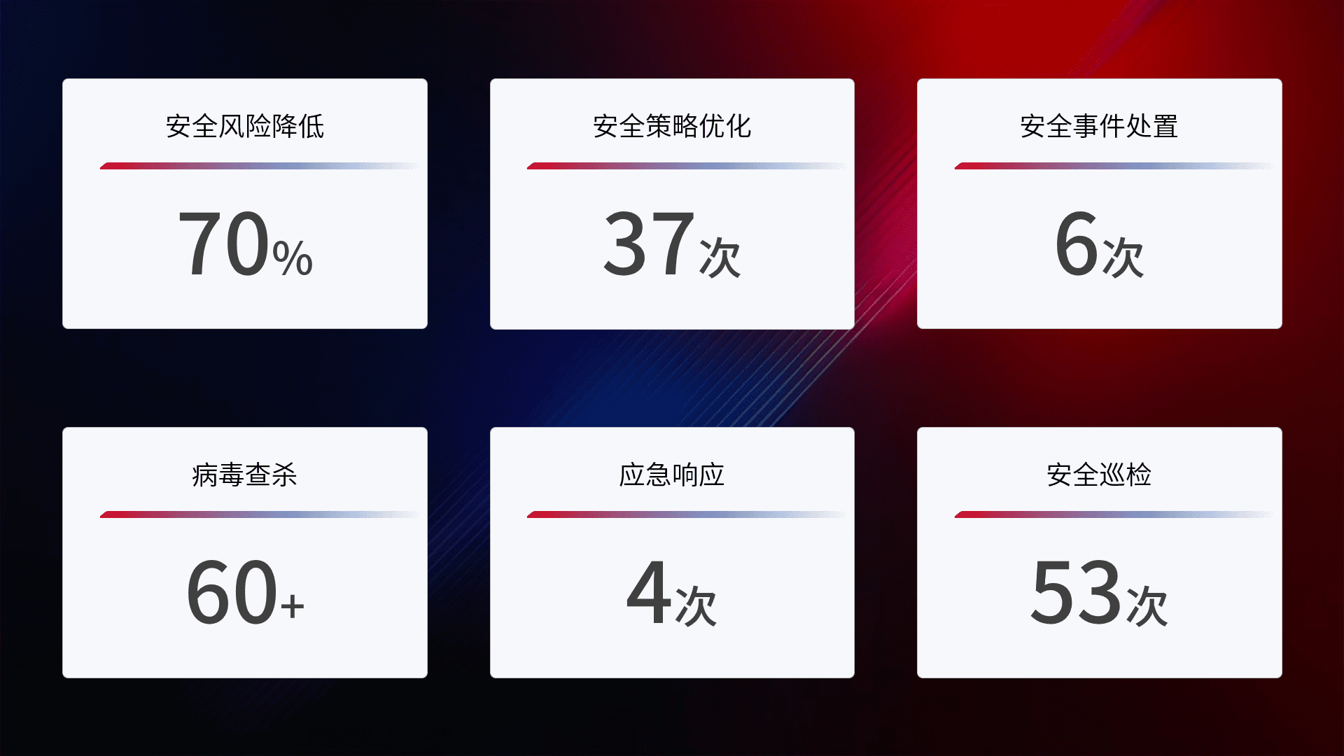提供全面的安全事件报告体系,,包括处置报告、、周报、、、季度和年度总结,,,,结合持续监控,,,帮助客户深入了解网络安全状况。。。